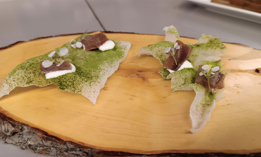 Crujiente de colleja con anchoa, yogur y flor de jaramago