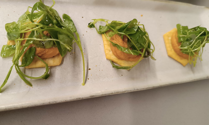 1. Colocar sobre la tostada o cracker unos 30g aproximadamente de hummus.